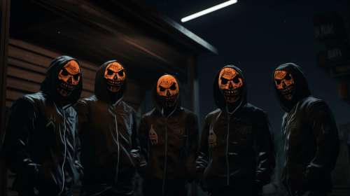 Five men wearing carved out pumpkins on their heads, black leather jackets, smoking cigarettes in a rundown garage, 1080p, creepy adult swim animation style, --ar 16:9