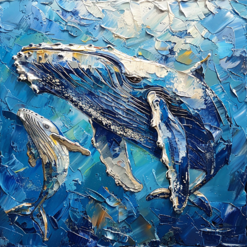 Humpback Whale and calf, Incorporate in the style of Anna Alekberova Poker cubist artist of Saatchiart and Artmajeur galleries 8k, high resolution, oil painting, soft brush strokes --stylize 350 --iw 2 --v 6.0