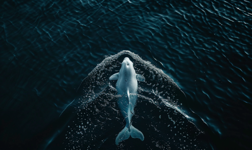 Beluga in navy blue water swimming towards the surface --ar 5:3 --v 6.0 --style raw
