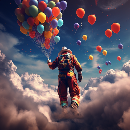 Lucy in the Sky most mind bending clowncore, streampunk just weirdness, dreamlike atmosphere, FEELING anxious the style of caras ionut, chris dyer, retrowave --v 5.2