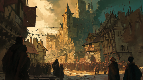 From the story Hunchback of Notre Dame, chapter 1, 1480's France, Depiction of Gringoire's struggle as he tries to capture the attention of the crowd with his play amidst the festival, Central Focus, Explosive Backdrop, Stormy Tranquility, Dramatic Horizon, Ephemeral Glow, Tempest Beauty, immersive foreground --ar 16:9 --v 6.0