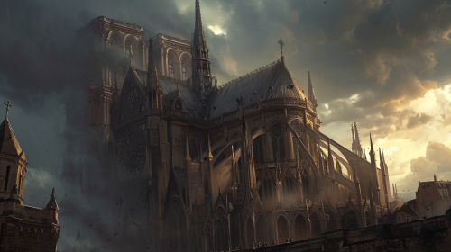 From the story Hunchback of Notre Dame, chapter 4, 1480's France, The interior of the Palace of Justice, focusing on its large, ornate windows and the crowd trying to view the play, Central Focus, Explosive Backdrop, Stormy Tranquility, Dramatic Horizon, Ephemeral Glow, Tempest Beauty, immersive foreground --ar 16:9 --v 6.0
