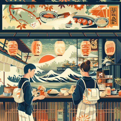 an illustrated advertisement for kaisendon donburi fast food at bangkok airport, in the style of japan house london --v 6.0