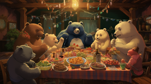 Ghibli studio, The bears were hungry, so they ate all the food on the table, --ar 16:9