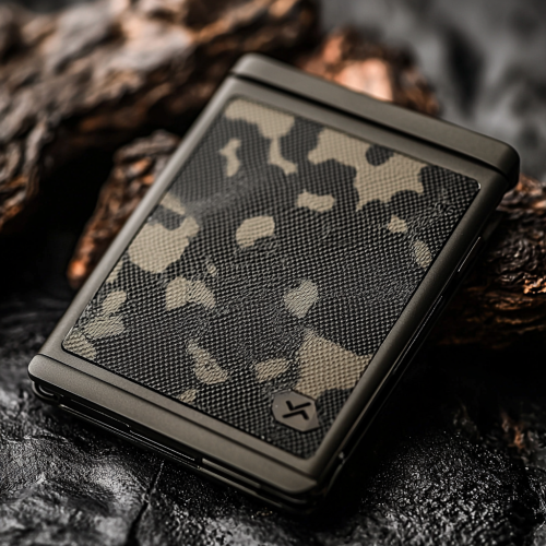 Envision a high-end metallic card holder with a sleek camouflage design. The body is crafted from brushed gunmetal, with a subtle, urban-inspired camouflage pattern laser-engraved onto the surface. Deep olive greens, muted browns, and dark greys blend seamlessly into the metallic texture, giving a rugged yet luxurious feel. The edges are polished with a matte black trim, while the trigger mechanism is designed in a matching black, allowing cards to pop up smoothly with a premium tactile feel. The engraved logo is placed subtly at the bottom corner, enhancing the masculine and modern aesthetic --q 2 --s 250