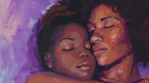 oil painting illustration closeup of a black mother and daughter against a purple background --v 6.0 --ar 16:9 --style raw --s 50