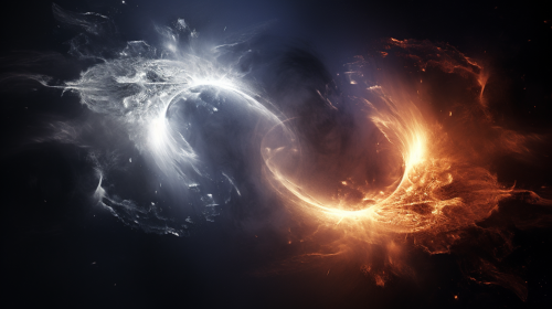 use gray dust and smoke to describe the shape caused by the duality of opposing magnetic fields called duality rotations and ring-shaped masses made of glowing electromagnetic particles in space --ar 16:9 --c 12