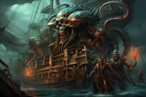 a side portrait of five fantastic creatures preparing to abort a ship, pirates of the caribbean style, detailed textures, renaissance design, steampunk and fantasy, lots of details, ultra realistic --ar 3:2