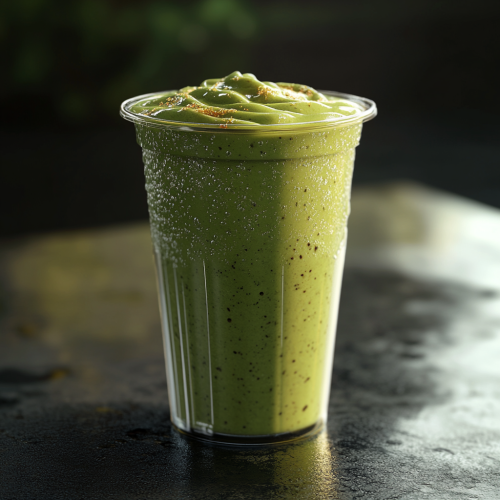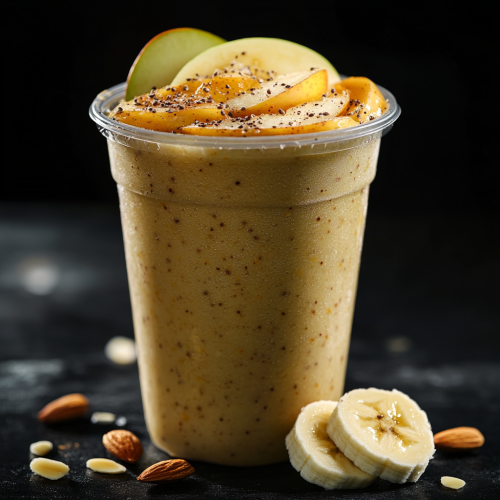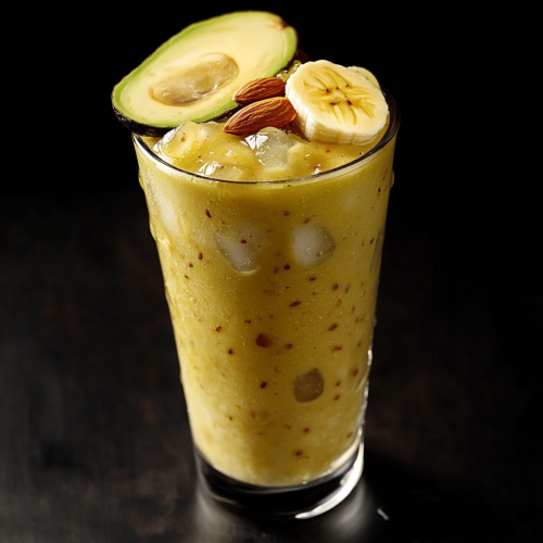 This is a pear smoothie with banana apple and oranges added smoothie. Please add real banana for decoration on the bottom of the image and almond on the bottom of the image for decoration. Hyper realistic, 16k , documentary style, Hyper-realistic 16K photo of a avocado smoothie in a 20 oz clear plastic cup, black background, professional food photography. Cut banana decoration on the bottom of the image. Condensation droplets on the cup surface. Aesthetic composition on a sleek black table. Shot with flash, high contrast. Styled like a luxury brand photoshoot. Photorealistic details --v 6.1