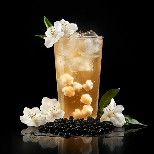 Hyper-realistic 16K photo of a Jasmine Iced Tea in a 20 oz clear cup, black background, professional food photography. Iced tea with a delicate SLIGHLY golden hue, accompanied by a scattering of jasmine flowers elegantly placed on the table. Small BLACK tapioca pearls settled at the bottom OF THE CUP. Condensation droplets on the cup surface. Aesthetic composition on a sleek black table. Shot with flash, high contrast. Styled like a luxury brand photoshoot. Photorealistic details, documentary style.