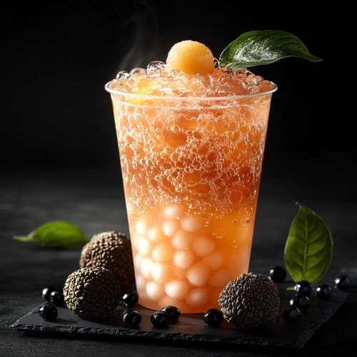 Hyper-realistic 16K photo of a Iced Tea in a 20 oz clear cup, black background, professional food photography. Iced tea with a delicate golden hue, 10 Small BLACK tapioca pearls settled at the bottom. Condensation droplets on the cup surface. Aesthetic composition on a sleek black table. Shot with flash, high contrast. Styled like a luxury brand photoshoot. Photorealistic details, documentary style. --v 6.1