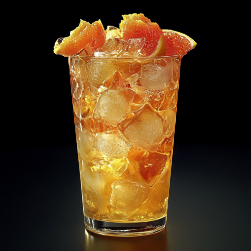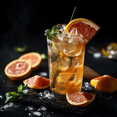 Professional photographer documentary of a Grapefruit iced , ginger , gogi berrywith honey in a 16 oz glass stange hyper Realistic 16k, hyper quality, Photorealism, Food photography Food, hyper