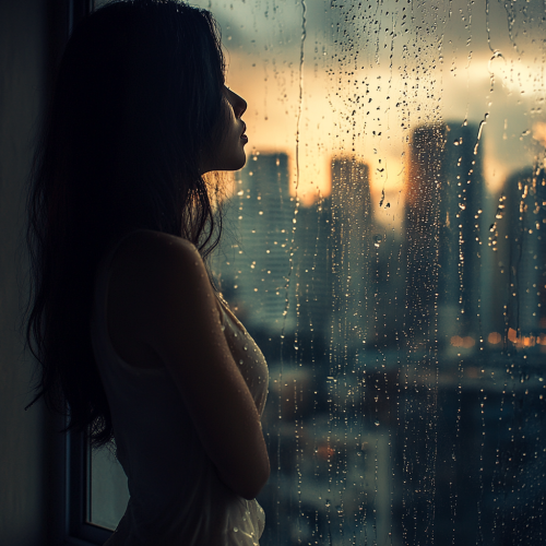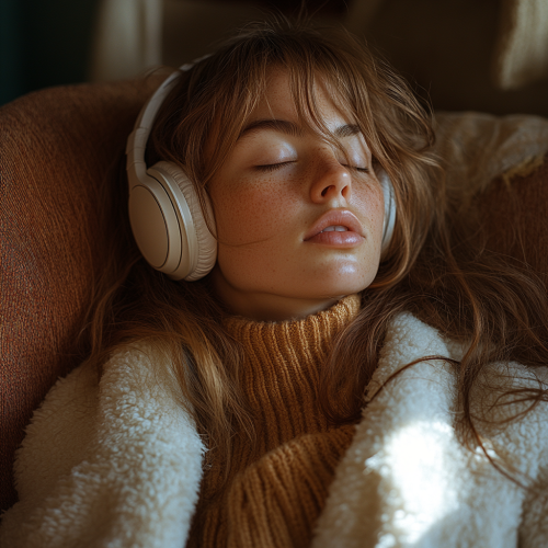 a 25 year old average looking woman in everyday clothing sitting in her livingroom lounge chair with closed eyes in tranquility and peace of mind listening to classical music in her headphones, medium full image, sharp focus, raw high resolution, ultra-detailed, natural lighting, brand photography style , brenzier effect, full shot, Fujifilm GFX100, --s 750 --v 6.1 --ar 1:1