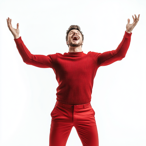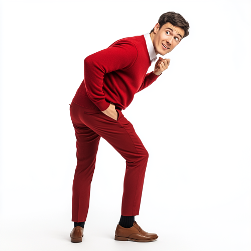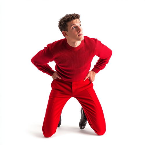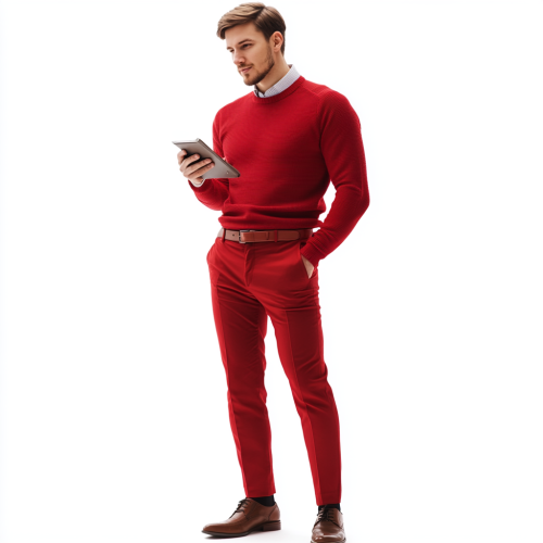 25 year old man with a slim build, leaning to look at something with interest, eager and excited, wearing a red sweater and red slacks, clean cut and professional. His hands are on his knees, we see his full body on a white background.