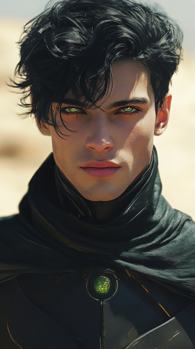 handsome 25 years old tanned skin persian male portrait, black hair, green deep eyes, front view, wearing fedaykin suit, dune fedaykin, desert planet Arrakis. sci-fi, hyper-realism. detailed, subsurface scattering, dark sci-fi character concept art, by Jeremy Mann, Anna Dittmann, magali villeneuve, Childe Hassam, Daniel F Gerhartz, Charlie Bowater, Eve Ventrue, Fernanda Suarez --ar 9:16 --v 6.1