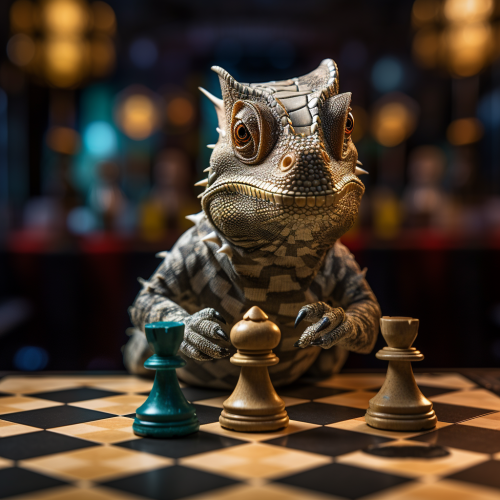ultra-realistic photograph captured with a Sony α7 III camera, equipped with an 85mm lens at F 1.2 aperture setting, of a chameleon on a chess board –ar 16:9 –v 5.2 –style raw