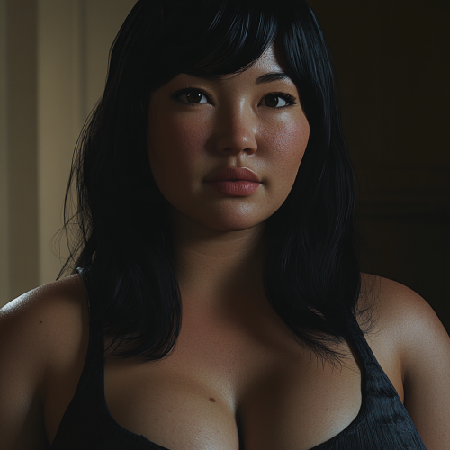 A photorealistic image of a 28-year-old woman, with black hair, chubby body, her upper body from head to below the chest visible, facing the camera directly. Detailed skin texture, realistic lighting with soft shadows, focus on natural expression and slight smile, hd quality, slight ambient light from the left, Canon EOS 5D, 50mm lens, f/2.0 aperture --style raw