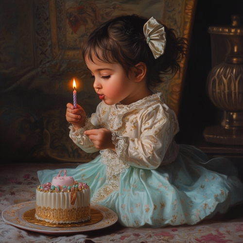 A beautiful full-length dress for a one-year-old Iranian girl, with a wide bow. The child is blowing out a birthday candle. The image should be in 768x1280 dimensions, photorealistic, capturing the moment with a soft and joyful expression.