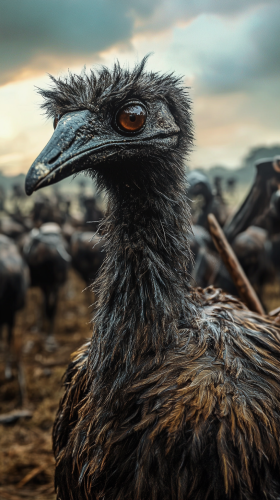 Great Emu War in Australia Full Body, Hyper Realistic Photography, , Cinema, Hyperdetail, Ultrahd, Color Correction, ultrahd, hdr, color grading, 8k' , no painting, drawing, unreal --ar 9:16