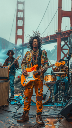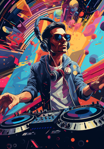a graphic that has an illustration, a DJ long shot and many other things, in the style of hyper-realistic pop-art fusion, split toning, imax, jcore, fine detailed, tempera, deceptive --ar 45:64