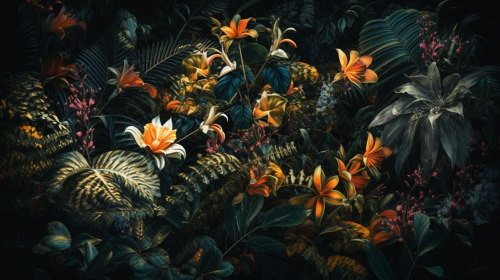 An wide shot of embossed rainforest floral pattern on black metal, elements of gold detail, cinematic light, sun sets, striking, beautiful, high quality realistic, cinematic light, hyper realistic, 18mm + extremely detailed + ultra-realistic, soft shadows, high quality, highly detailed, ultra realistic, ultra detailed, extremely detailed, intricate detail, fine details, , 4k + uhd + 3d + octane render + cinematic