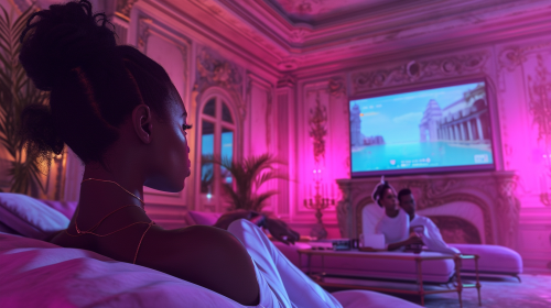 STYLE: Hyper Realistic Fantasy environment. Close up of atv showing netflix. a young black woman is sitting on the couch watching the tv. The setting is in a posh living room. . A bank teller is handing money over to a robber. The setting is in an upscale bank. GENRE: Fantasy Dreamy and dramatic PASTEL colors. include fantasy elements and the color pink. . TAGS : Cinematic framing wide shot | CAMERA: :RED Dragon Camera 8k. Focal length: 23 mm wide lens Shot Type: Wide Shot | COMPOSITION: low angle | LIGHTING - Bright lighting, photo realistic } TIME OF DAY: morning --ar 16:9 --v 6.0
