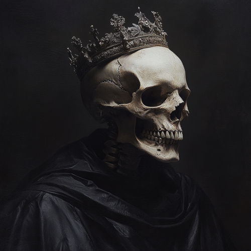 A highly detailed, ultra-realistic image of Death in human form, depicted from the clavicles to the head, wearing a black cloak and a crown. The face is a well-defined human skull, evoking a sense of sovereignty and authority. The atmosphere is dark and intense, with shadows enhancing the skeletal structure, and the crown is regal, adding to the majesty of the figure. The background is subtle and dark, keeping the focus on the details of the skull and the cloak, with textures adding to the lifelike impression.