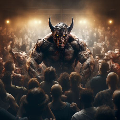 front view of demon and evils crowd are cheering infront of the boxing ring, hyper realistic, 4k