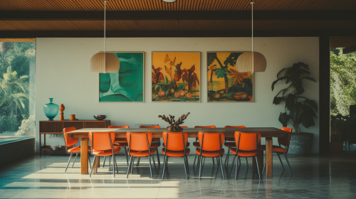 blank wall behind table front view in style of Jonathan Adler dinning room empty white wall behind furniture , elegant --no chandelier --ar 7:5 --s 300 --v 5.2