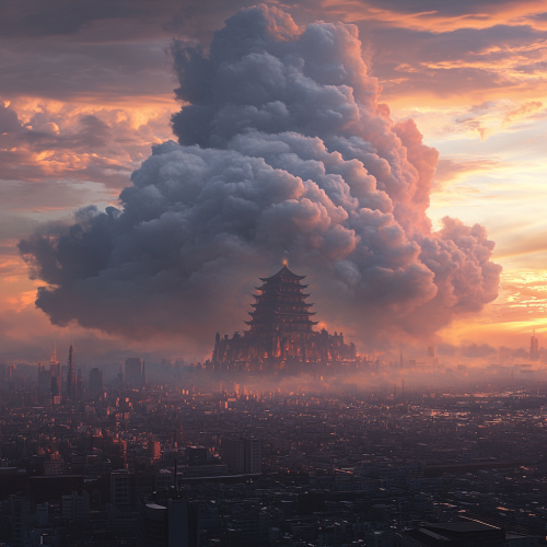 an eerie white misty-like cloud in shape of the white mist temple-like castle, passing by a city in a sunset covering all the landscape as it passes by. Hyper realistic art.