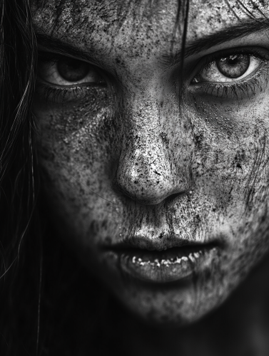 Hyper-realistic, highly detailed, high-resolution black and white photo of a female face with olive skin, holding a flower in her mouth. The focus is on the extreme realism of the skin, showcasing visible pores, fine lines, and the subtle creases of the lips. Emphasize the skin texture and details as the main element of the image. --ar 3:4