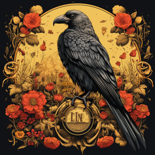 vintage image in the style of mexican/italian movie posters of a large golden medaillon with a huge number 25 engraved into, a black raven next to it, surounded by colorful tropical flowers, golden background