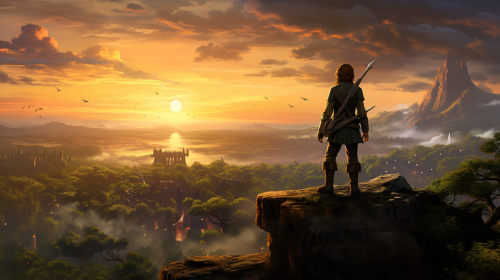 Link from "legen of zelda" contempling Hyrule 's land at sunset, movie scene, photography, hyper realistic, natural lights --ar 16:9