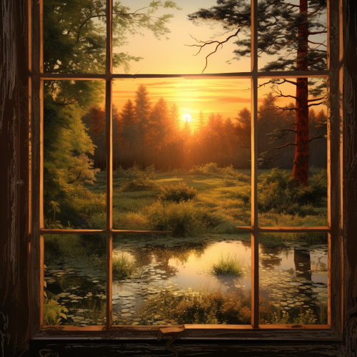 old Farmhousewindow outisde forest view sunset reflection, hyper realistic, 4k quaility , deep detailing
