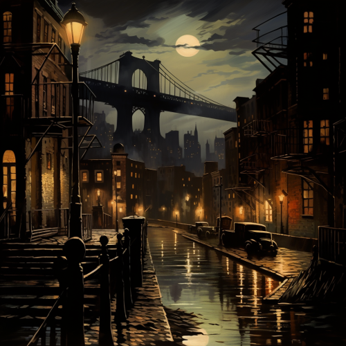 1920s city, night, darkness, raised bridge, illustration, --ar 1:1