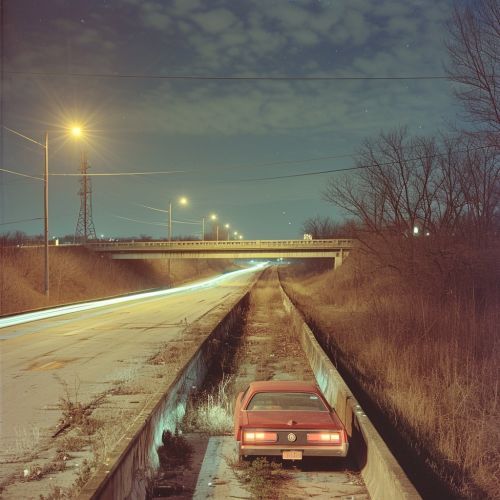 Photography taken from a bridge, above a highway, in the US. At night. Nostalgic atmosphere. --stylize 250 --no people, blurry --v 6.0