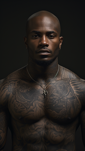 capture in 4k, attractive African American man, deep ebony skin, both arms and chest covered in tattoos, he’s wearing a black button up dress shirt, the top 3 buttons are unbuttoned showing his tattoos, he has a low haircut, he has light brown eyes, he’s smirking, looking directly at the camera