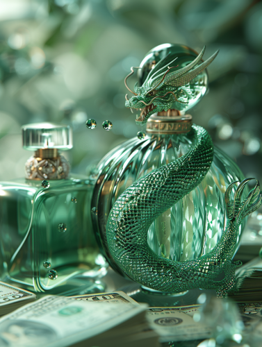 close-up, auspicious Dragon theme, abstract minimalist dragon design, green dragon, Green gemstone texture, crystal clear,a big green bottle of perfume by the dragon side, clear background, C4D OC render style, softnatural lighting, simple and elegant space with a lot of cash dropping and stacked. --ar 3:4 --stylize 750 --v 6.0