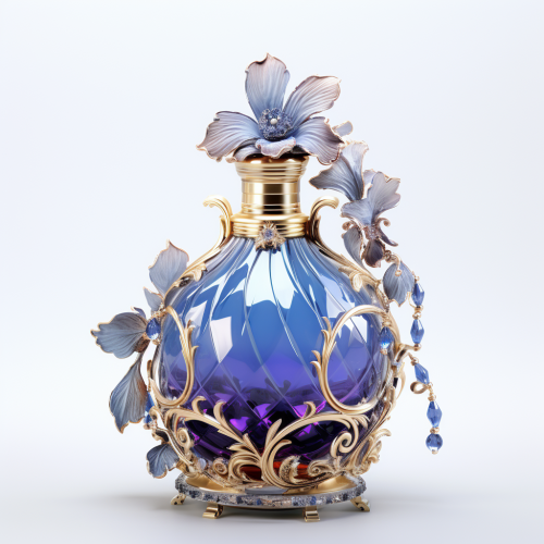 Create a promotion card of a luxury perfume , dimensions 3.5*2 inches. The design should be elegant and high-end, featuring a minimalistic and sleek background with a subtle texture. Place a sophisticated glass perfume bottle in the foreground, showcasing exquisite craftsmanship and intricate details. The bottle should be the focal point and be illuminated by soft, ambient lighting to highlight its luxurious qualities. Use a stylish, modern font to display the brand name and perfume details, conveying a sense of exclusivity and elegance. The color scheme should be a harmonious blend of gold, black, and white, symbolizing opulence and sophistication. --v 6.0 --s 750