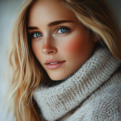 Portrait of a blonde woman, 25 years old, with light blue eyes and soft features, wearing a cozy sweater, looking slightly to the side, natural light, photorealistic