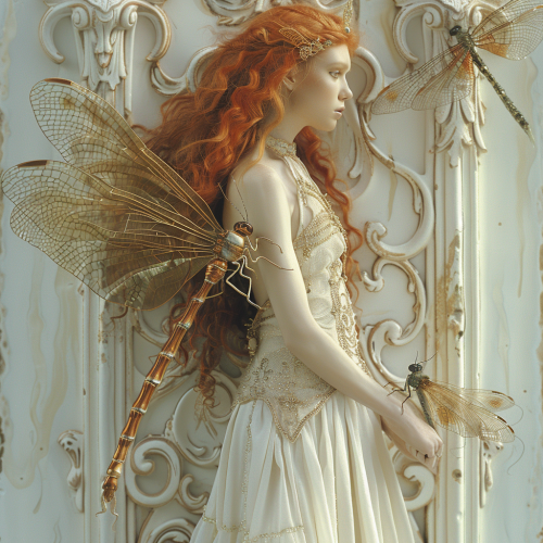 a detailed photograph of a magical and pure light and breezy red haired Greek goddess standing by her spirit animal 🦁, a dragonfly, Michael Parkes style, surreal, symbolism, --v 6.0 --s 250