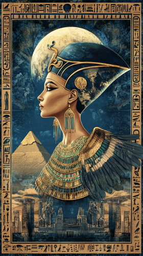 design featuring an elegant portrait of Nefertiti on one side and the goddess Isis with wings outstretched on the other, with the Great Pyramids in the background under a twilight sky. Incorporate intricate Egyptian hieroglyphs around the edges, with golden accents to highlight the ancient aesthetic. Use a color palette of deep blues, rich golds, and soft desert tones for a modern yet timeless feel. --ar 9:16