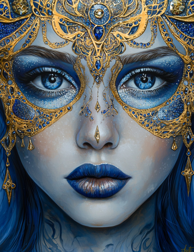 Portrait of a beautiful young woman, AI goddess creative face painting, blue and gold, surreal, intricate details, gems, big eyes, long hair, beautiful lips, futuristic background --ar 2588:3375 --q 2 --v 6.1