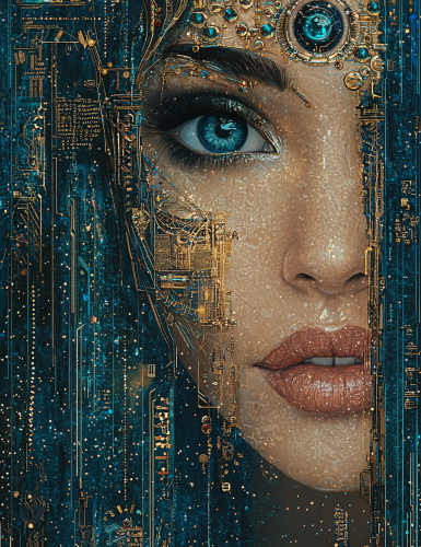 Portrait of a beautiful young woman, AI goddess, blue and gold, surreal, intricate details, gems, big eyes, long hair, beautiful lips, futuristic background --ar 2588:3375 --v 6.1 --q 2
