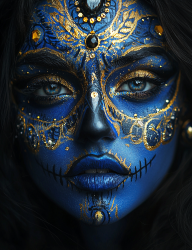 Portrait of a beautiful young woman, Day of the dead catrina, AI goddess creative face painting, blue and gold, surreal, intricate details, gems, big eyes, long hair, beautiful lips, futuristic background --ar 2588:3375 --v 6.1 --q 2