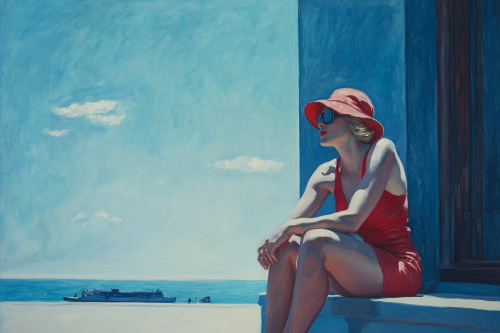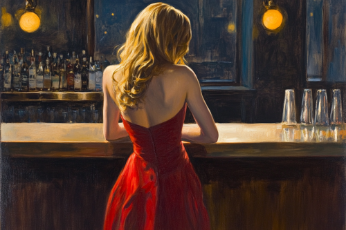An hyperrealist painting by Edward Hopper depicting a glamour woman , wearing glamour dress waiting alone at a bar. This artwork features emotional expression and body movement. --ar 3:2