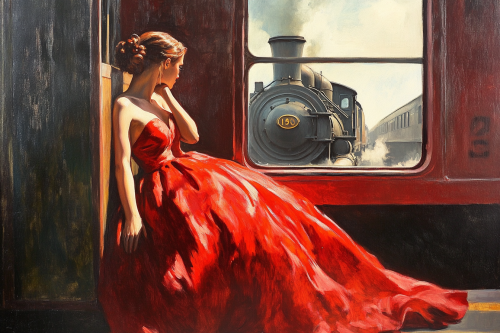 An hyperrealist painting by Edward Hopper depicting a glamour woman , wearing glamour dress waiting alone in a train station. Background of steam engine. This artwork features emotional expression and body movement. --ar 3:2