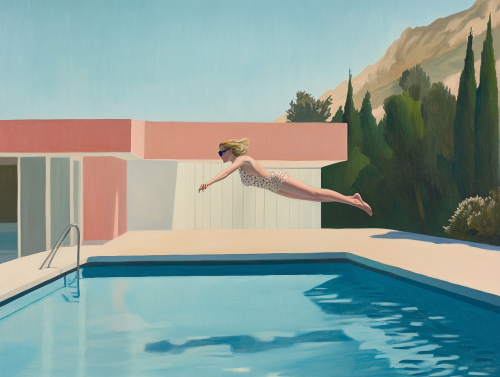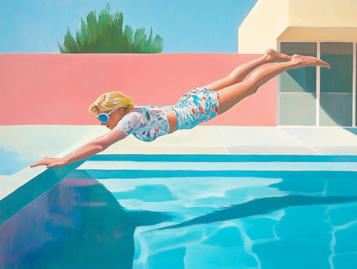 An hyperrealistic painting by David Hockney and Edward Hopper depicting a woman with blond hair wearing sunglasses and a glamour beachwear diving into a pool in front of a pastel-colored modern architectural building. --ar 4:3