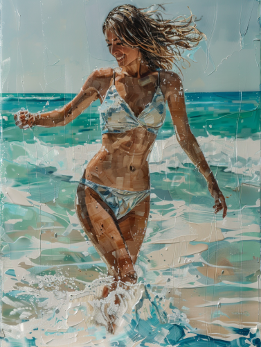 Setting: Early morning at Coral island, providing a relaxed and quiet backdrop with a sense of space and peace. • Action: The four models, in PENTI's beachwear, casually walk and enjoy the beach, wading in the water. • Camera Shot: Starting with wide shots while the beach is less populated, then including close-medium shots for model expressions and product details.