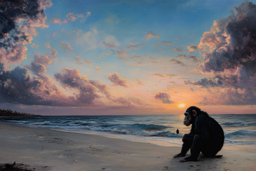 An hyperrealist contemporary painting by Turner depicting coastal seaside with tormented blue sky with various clouds and colorful hues. Sunrise. In the foreground on the beach, 2 chimpanzees seating and watching the sunrise. --ar 3:2